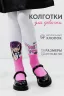 Яркие детские колготки. Верхняя часть белого цвета, низ розового с изображением девочки надписью "like HEY YOU cool". Стопа колгот в полоску.