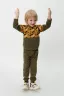 Костюм выполнен из двух видов футера - обычного и набивного. В комплект входит свитшот и брюки прямой посадки. Принт с изображением скейтбордов выполнен в области плеч и на задних карманах брюк. Идеально подойдет как для занятий спортом, так и для прогулок на свежем воздухе.