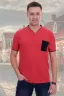 Мужская футболка из кулирки с лайкрой. Воротник-стойка с небольшим треугольным вырезом, темная окантовка горловины и рукавов, темный накладной карман на груди.