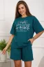 Костюм женский, выполнен из трикотажного полотна кулирка. Костюм состоит из футболки и шорт. Шорты с карманами, со строчкой на передней части полочки вдоль. Футболка свободного силуэта, вточная горловина, на полочке выполнена печать.