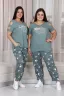 Костюм женский: туника и брюки. Туника прямого силуэта, вырез Y-образный. Полочка несколько короче спинки, сбоку разрезы. На полочке принт. Рукав не цельный, два хляста, расположенные через расстояние друг от друга, втачаны в боковые части рукава. Брюки свободные, "бананы", внизу передней и задней части по две встречные складки, манжеты. В брюках удобные внутренние карманы, пояс выполнен на многоигольной машине.