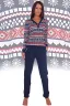Костюм из интерлока пенье футболка с длинным рукавом с брюками. У футболки V-образный воротник на двух пуговицах, цветные геометрические узоры и снежинки на горизонтальных полосах. Брюки однотонные, с карманами.