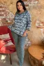 Костюм женский: туника и брюки. Туника прямого силуэта с цельнокроенным рукавом 3/4, со швом. Воротник отложной, спереди переходит в стойку. Полочка короче спинки, по боковым швам разрезы. Брюки полуприлегающие, с манжетами. На передней половинке внутренние карманы.