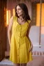 Сарафан приталенный, расклешенный к низу, на бретелях, с V-образной горловиной спереди, длиной выше колена. Застежка на пуговицы. Внутри сарафан на хлопковой подкладке, благодаря которой верхний слой ткани не просвечивает