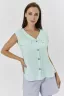 Женская туника-майка на пуговицах, без рукавов, свободная, с удлиненной спинкой и фигурной линией низа. По шву соединения кокеток с полочкой расположены декоративные клапаны. Спинка с кокеткой и складкой. Горловина спинки и проймы обработаны бейкой из основного полотна.